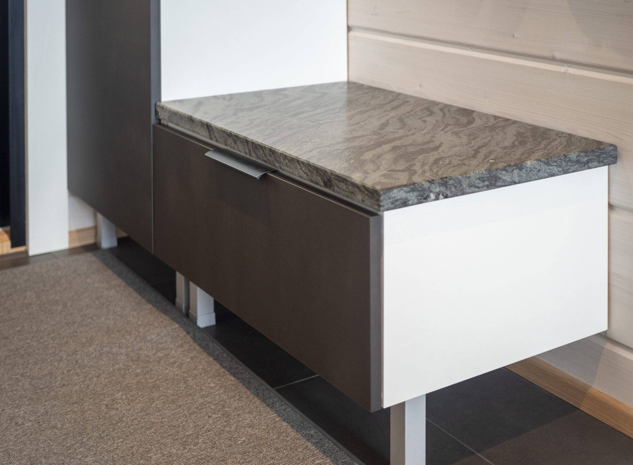 Makuuhuoneisiin sijoitettiin kiinteät liukuovikaapit ja eteiseen korkea kaappi sekä kivipintainen istuintaso.