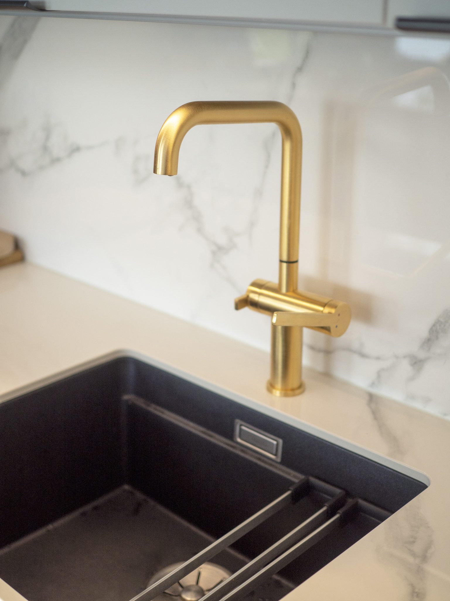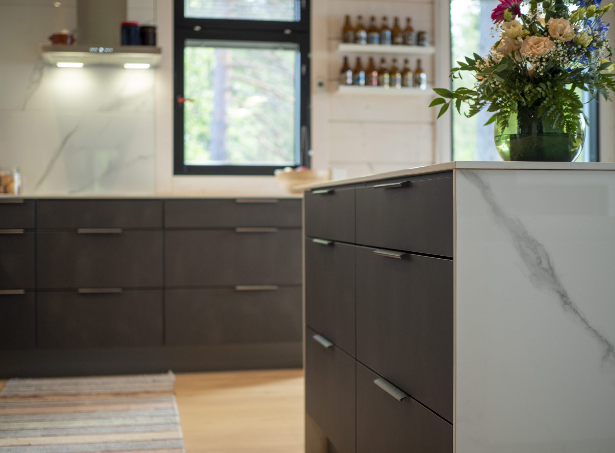 – Keraamisella tasolla on samat ominaisuudet kuin kivellä. Se kestää kosteutta ja kuumuutta, ja pinta on helppo pitää puhtaana. Lisäksi siitä saa halutessaan kivitasoa ohuemman, mikä tuo keittiöön modernia ilmettä, Marita kertoo.