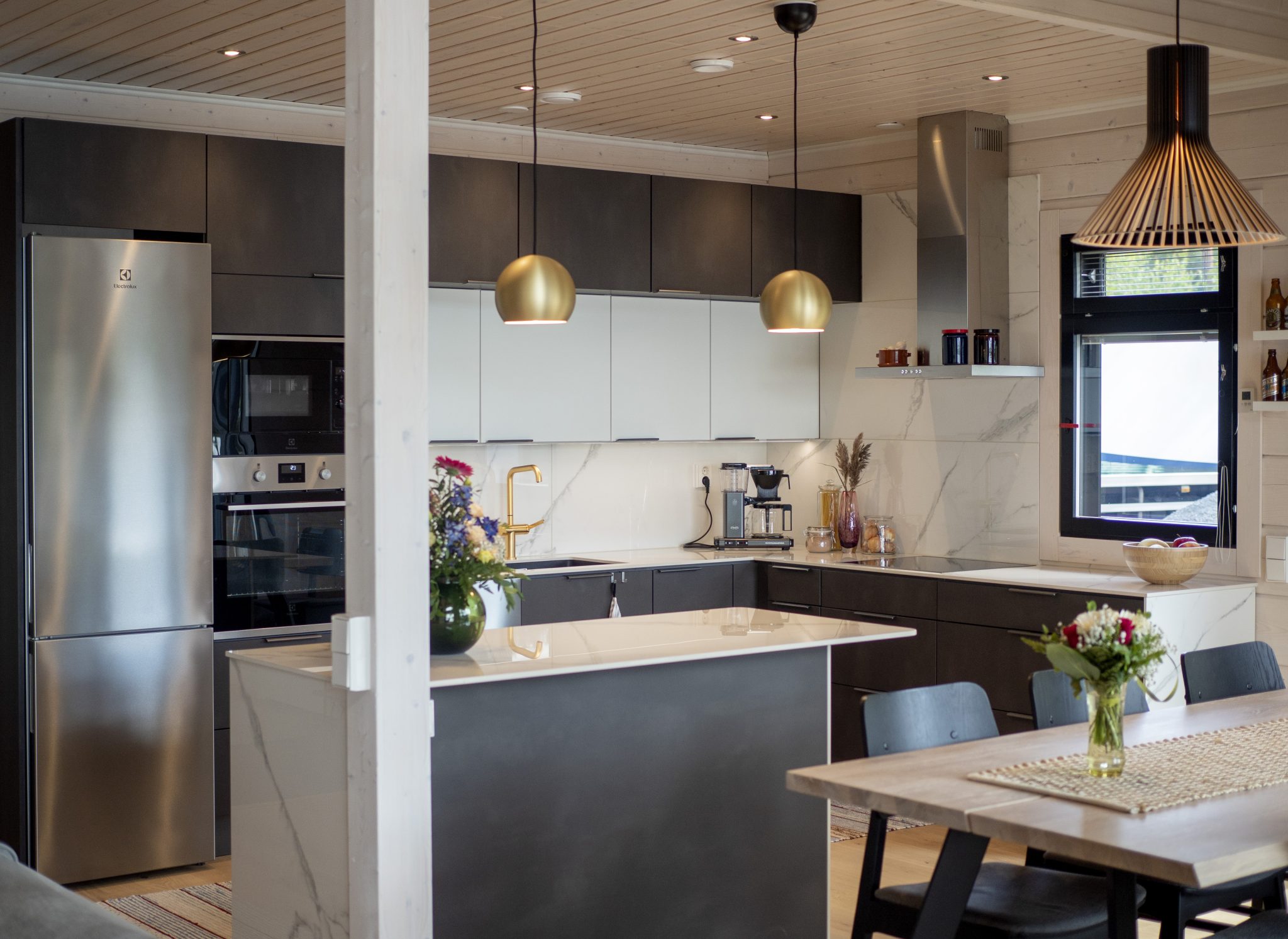– Tällaisessa rakennusprojektissa oli tärkeää, että sovituista aikatauluista ei tarvinnut joustaa. Vehkapuu toimitti kaiken ajallaan ja sovitusti, ja koska kaikki kalusteet uusine kodinkoneineen tulivat samasta paikasta, se teki rakentamisesta sujuvampaa, Marita kiittelee.