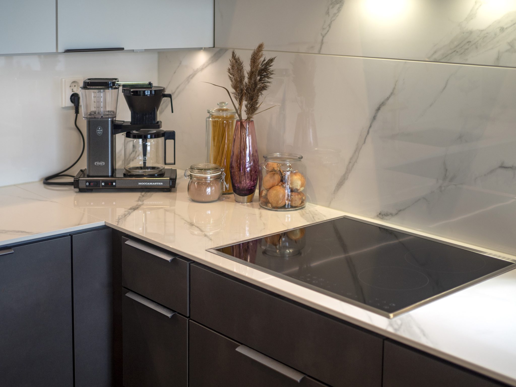 Avonaisen keittiön kulmakivi on kiiltävä keraaminen taso, jonka valkoisen pinnan kuviointi muistuttaa marmoria. Samaa keraamista tasoa käytettiin myös välitilassa, josta se kohoaa näyttävästi lähes katon korkeudelle keittiön perällä lieden edessä.