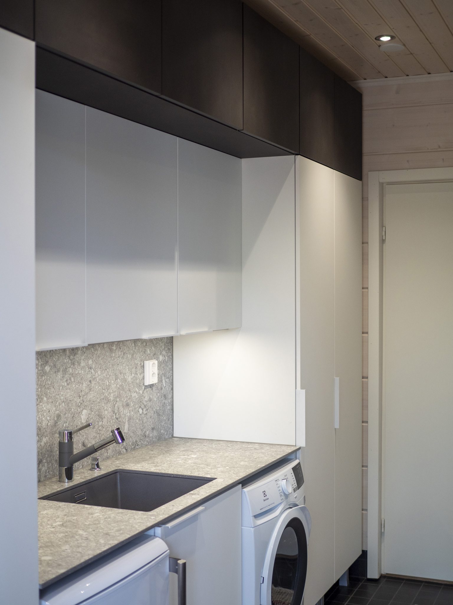Kodinhoitohuoneen ja kylpyhuoneen tasot sekä välitilat ovat rouheasti kuvioitua harmaata keramiikkaa. Kodinhoitohuoneen työskentelytason molemmin puolin sijoitettiin korkeat kaapit, ja keittiöstä tuttua kahden koon komeroratkaisua hyödynnettiin myös tässä tilassa. Ylimmät komerot avautuvat kätevästi ponnahdussalvan avulla.
