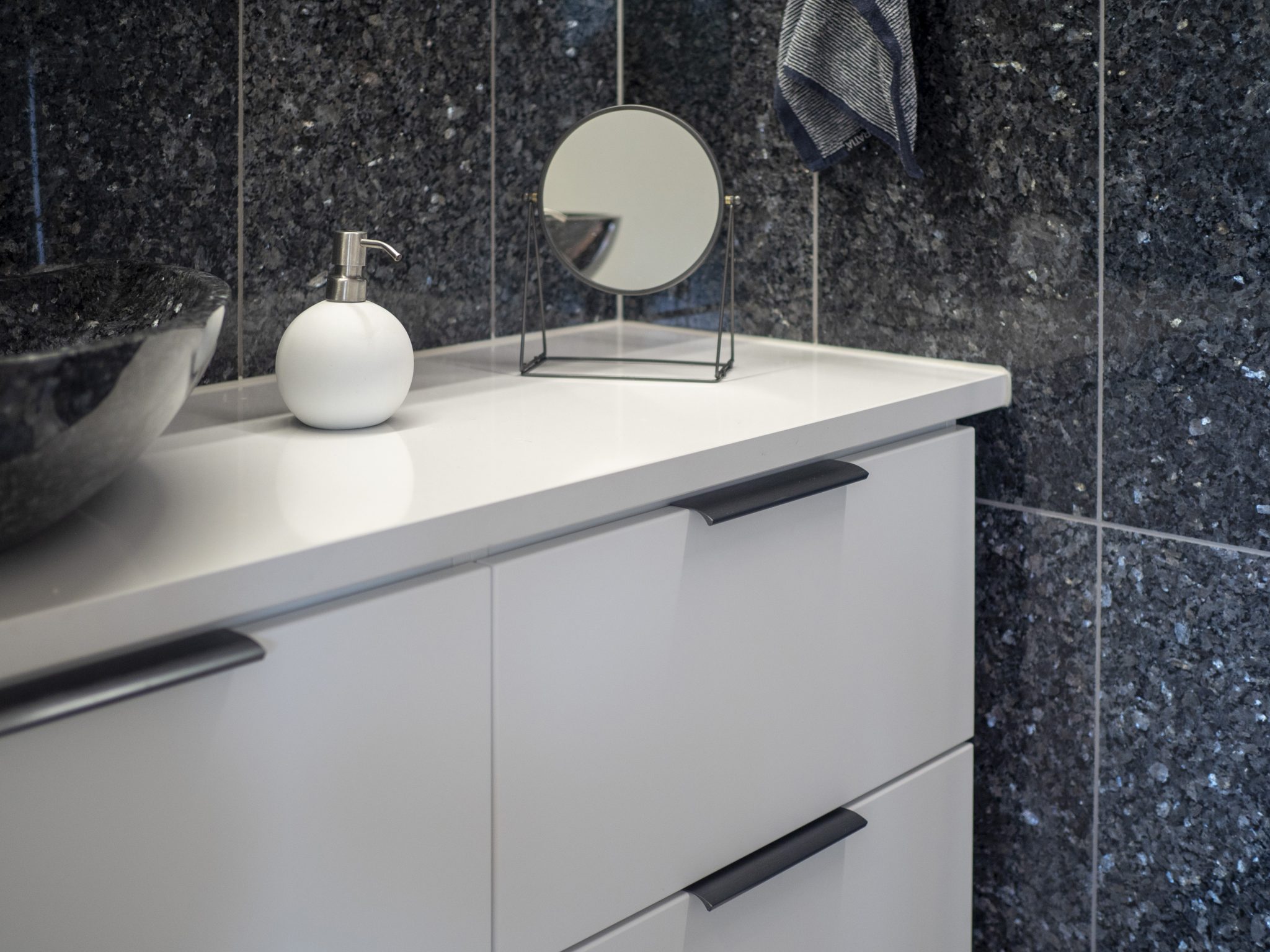 Keittiön kaappeihin valikoituivat samettisen mattapintaiset ovet valkoisessa ja tummanharmaassa teräksen sävyssä. Kiiltävän keramiikan kanssa kokonaisuus on rauhallinen ja harkittu. Päällekkäin sijoitellut yläkaapit ovat syvyydeltään kahta eri kokoa, mikä tuo kepeyttä välitilaan mutta antaa myös tilaa työskentelyyn sekä säilytykseen. Tason alle sijoitelluissa toiminnoissa on hyödynnetty niin kulmamekanismia kuin piilolaatikoitakin. Kokonaisuuden viimeistelevät selkeälinjaiset profiilivetimet. Myös modernit kodinkoneet hankittiin Vehkapuun kautta.